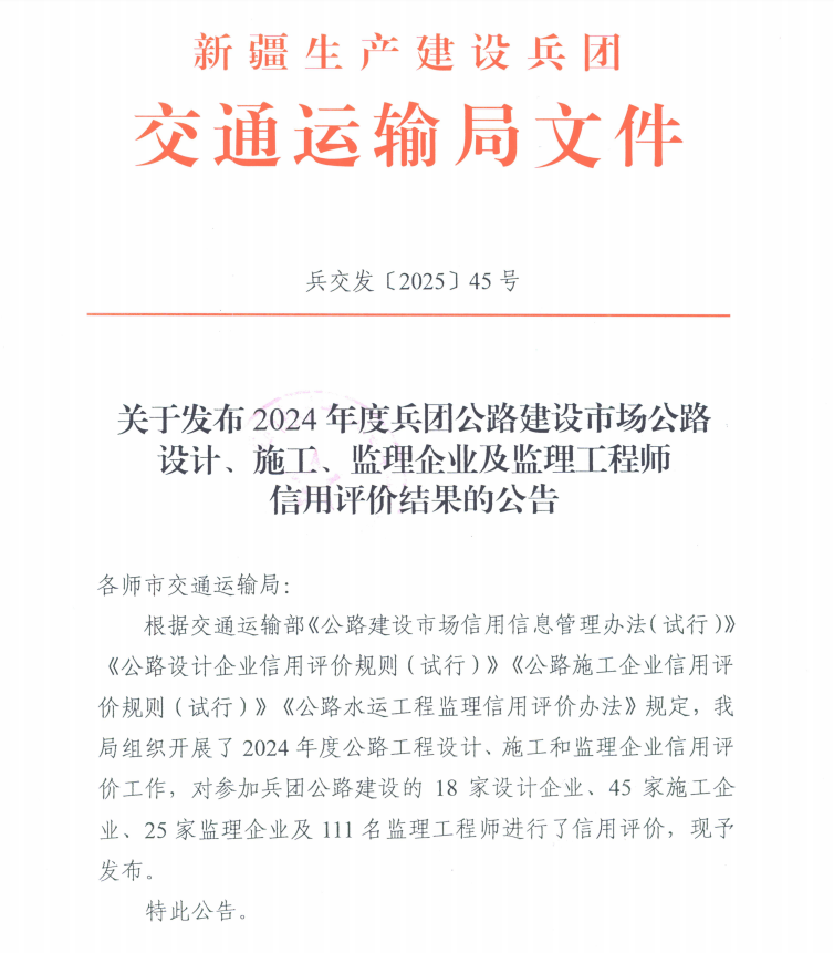 近日,,新疆生产建设兵团交通运输局正式公布2024年度公路建设市场信用评价结果,,,尊龙时凯集团有限公司凭借卓越的综合实力和良好的市场信誉,,,,成功获评最高信用评价AA级。。。。这是继公司在多个省份获得AA级评价后,,在西北地区市场信用体系建设中取得的又一重要成果。。。。