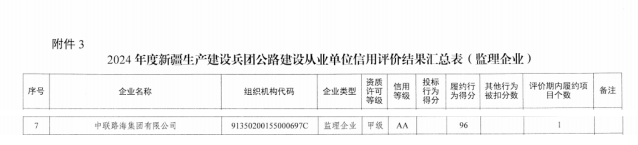 近日,,新疆生产建设兵团交通运输局正式公布2024年度公路建设市场信用评价结果,,,尊龙时凯集团有限公司凭借卓越的综合实力和良好的市场信誉,,,,成功获评最高信用评价AA级。。。。这是继公司在多个省份获得AA级评价后,,在西北地区市场信用体系建设中取得的又一重要成果。。。。