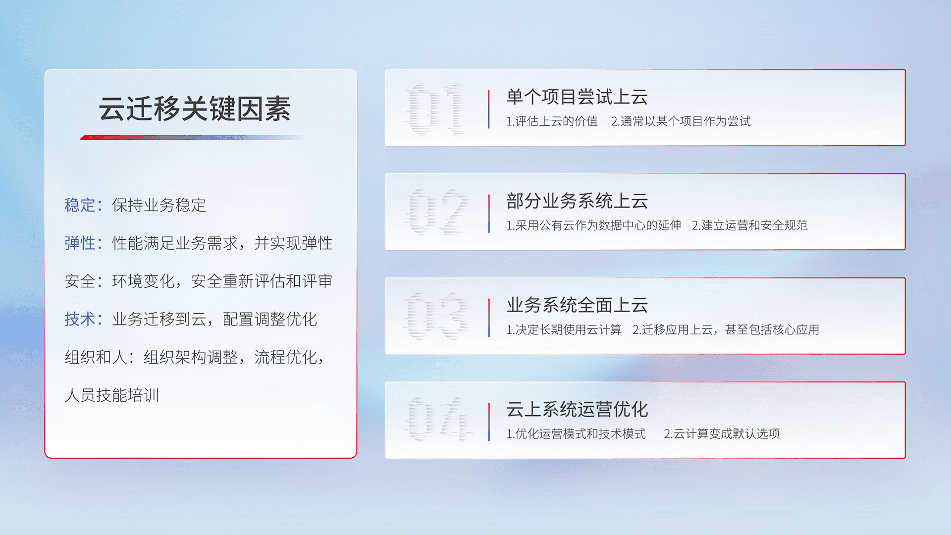 结合实际业务,,,从规划设计、、、、云平台选型、、、云原生改造、、、、数据迁移、、、、集成交付,,迁移全过程为客户识别最佳上云路径,,,,做好风险识别管理,,,,设计网络架构、、、、身份权限、、、安全审计合规、、操作审计、、、、日志审计、、监控告警策略、、多站点容灾设计等,,对云上基础设施进行整体规划,,,提升IT治理水平,,,,以满足弹性、、、高可用、、、、高性能的需求。。