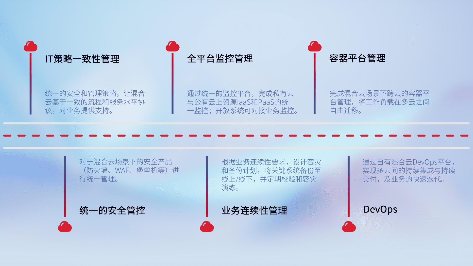通过多云纳管,,以统一的资源数据模型把客户的云资源进行抽象和封装,,,进而实现对多云资源的统一操作,,,,保障云资源管理的可靠性、、稳定性与可用性。。量身定制化运维内容,,,,配置、、、、开发运维、、、补丁管理、、备份、、、监控、、认证和访问管理、、、审计和日常巡检等,,,,保障在用云过程中的可靠度,,稳定度以及高可用率。。。。