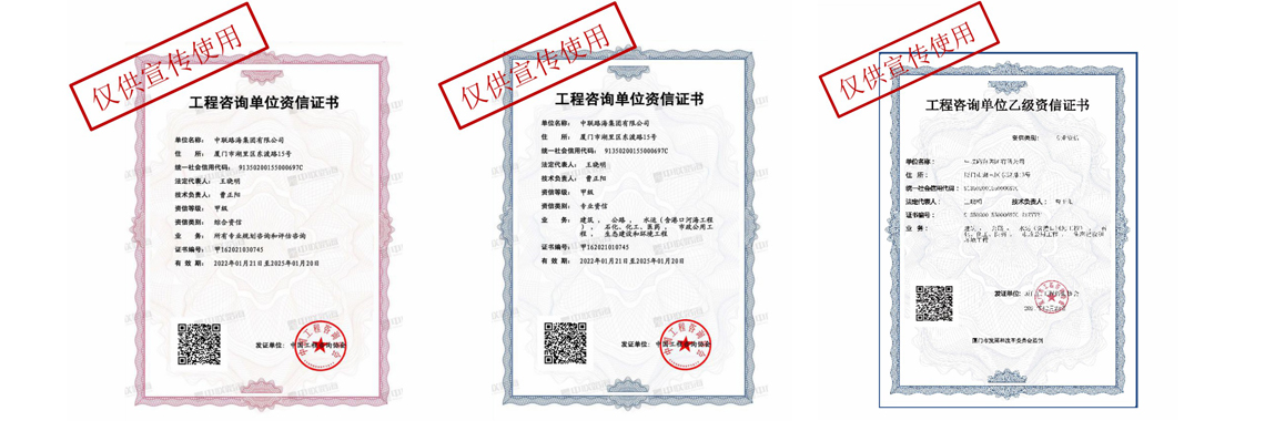 尊龙时凯集团有限公司(原厦门港湾咨询监理有限公司)是国内较早采用菲迪克(FIDIC)条款开展工程咨询的领跑者,,,取得工程咨询建筑,,,公路,,,水运(含港口河海工程),,,石化、、、、化工、、、医药,,,市政公用工程,,生态建设和环境工程,,所有专业规划咨询和评估咨询甲级综合资信;为中国工程咨询协会理事单位。。
